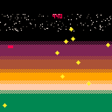 while(1)do b={}e=128r=rnd z=rectfill n=90s=0y=n while(y<e)do q=20+flr(r(n)) if(r(5)<1)add(b,{x=e,y=q,s=q,v=(r(30)-15)/36}) cls()d=31i=0 for h in all{2,36,73,159,243}do z(0,d,e,e,h)fillp(0xa5a5)z(0,d,e,d+3,h)fillp()d+=17-i i+=2end f=btn(4)a=0 if(f and j<1)z(15,y,e,y,10)a=1j=15 if(not f)j=0 z(9,y,14,y-2,8) if(btn(2))y-=2 if(btn(3))y+=2 for d in all(b)do d.x-=2 c=d.x d.y+=d.v if(y<d.y+6 and y>d.y)then if(a>0 and c>9)d.y=e s+=10a=0 if(c>9 and c<14)y=e end ?"◆",c,d.y,10 if(d.x>-999)pset(c/3+n%e,d.s%20,7)pset(c/4+n%e,d.s%18,5) end j-=1 ?s,60,0,8 flip() end end